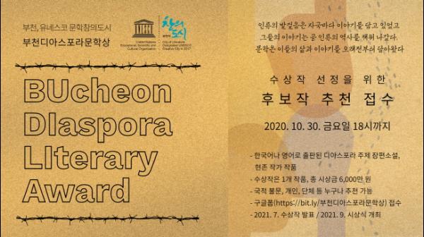 유네스코 문학 창의도시 부천시는 ‘제1회 디아스포라 문학상’ 수상작을 선정하기 위한 후보작을 10월 30일까지 추천받는다.