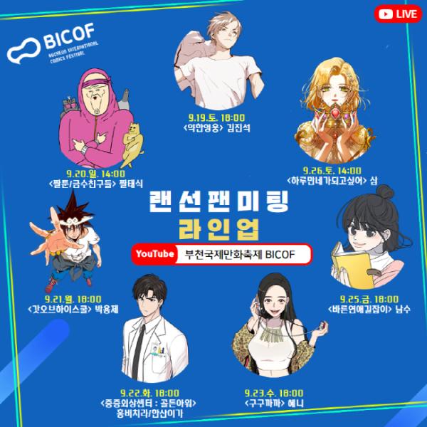 올해 온라인 개최를 앞둔 부천국제만화축제가 ‘랜선 팬미팅’에 참여할 웹툰 작가 최종 라인업을 1일 공개했다.
