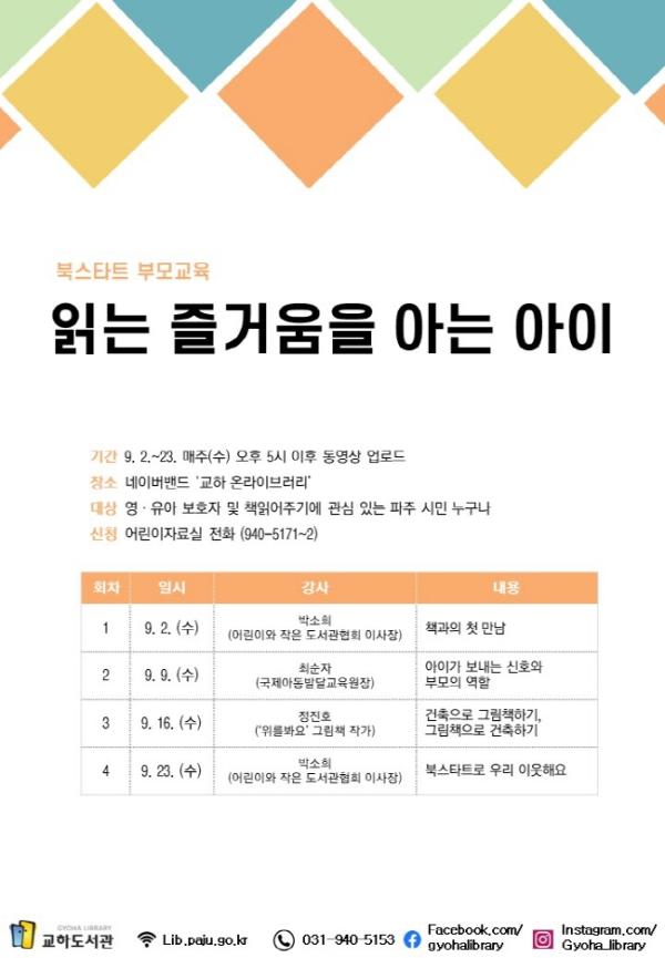 파주시 교하도서관은 2일부터 23일까지 매주 수요일에 총 4회에 걸쳐 ‘북스타트 부모교육, 읽는 즐거움을 아는 아이’를 운영한다.