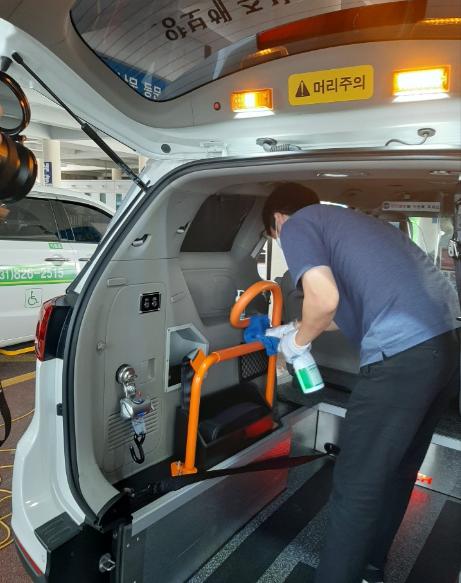 의정부시 시설관리공단(이사장 강은희)에서는 이동지원센터 행복콜 차량을 이용하는 교통약자의 코로나-19 예방을 위하여 소독을 철저히 시행하고 있다고 밝혔다.