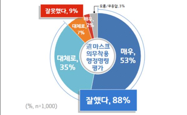 경기도민 10명 중 9명이 도의 마스크 의무착용 행정명령에 대해 ‘잘했다’고 평가한다는 조사결과가 나왔다.