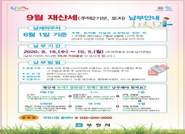 재산세 납부 안내문은 아파트 단지 및 관공서에 부착할 예정이며, 기타 궁금한 사항은 부천시 콜센터(032-320-3000) 및 재산세과 재산세팀(032-625-3670)에 문의하면 된다.