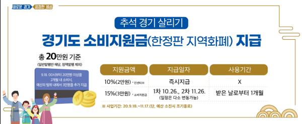 한편, 소비지원금(한정판 지역화폐)은 20만원 충전으로 기존 10% 인센티브와 함께 15%에 해당하는 추가 소비지원금 등 역대 최고 수준의 혜택을 제공하는 경기도의 경제방역정책이다. 소비지원금(한정판 지역화폐) 혜택을 받으려면 9월 18일 이후 사용액 기준으로 늦어도 11월 17일까지 최소 20만원을 소비해야 하는데 1천억원 규모의 예산 소진 시까지 경기지역화폐카드 또는 모바일 지역화폐를 소지한 모든 경기지역화폐 이용자를 대상으로 ‘선착순’ 지급한다.