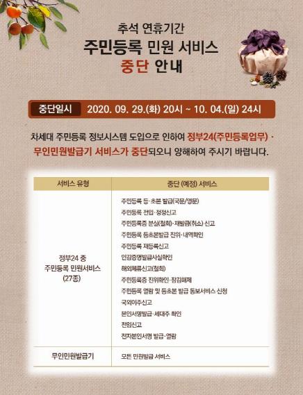 추석 연휴기간 중단되는 서비스는 ▲정부24의 주민등록관련 발급·조회서비스 27종 ▲관내 설치된 무인민원발급기(40대)의 모든 서비스 ▲1382 콜센터의 주민등록증 진위확인서비스 ▲행정·공공기관 홈페이지의 주민등록 정보 확인 서비스다.