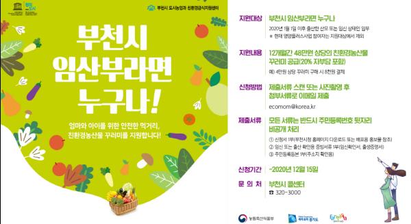‘부천시 임산부 친환경농산물 꾸러미 지원사업’은 현재 임신 중인 임부뿐만 아니라 2020년 1월 1일 이후 출산한 산모라면 누구나 올해 12월 15일까지 신청할 수 있다. 접수는 이메일(ecomom@korea.kr)로 받는다. 다만, 보건소에서 시행중인 영앙플러스사업과는 중복신청할 수 없다.