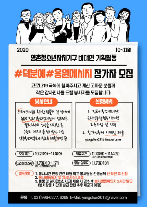 (재)김포시청소년재단 양촌청소년문화의집은 소속 청소년운영위원회 및 동아리 청소년들이 직접 기획한 ‘양촌청소년의 #덕분에#응원메시지’ 비대면 기획활동을 진행한다.