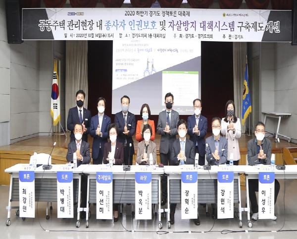 경기도의회 교육행정위원회 박옥분 의원(더민주, 수원2)이 좌장을 맡은 「공동주택 관리현장 내 종사자 인권보호 및 자살방지 대책시스템 구축제도 개선」을 위한 정책토론회가 14일 경기도의회 1층 대회의실에서 개최됐다.