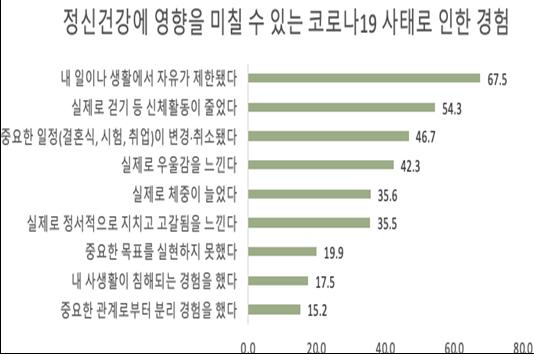 코로나19 트라우마 스트레스 정도를 물었을 때 전체의 31.0%가 ‘즉각 도움이 필요한 고도의 스트레스 상태’에 해당됐다. 1차 조사 19.3%와 비교했을 때 약 1.6배에 달하는 11.7%p 증가한 것으로 심리방역이 시급하다고 할 수 있다. 정신건강의 악화 요인을 물었을 때, ‘일상자유의 제한’ (67.5%)이 가장 높은 응답률을 보였고, 걷기 등 신체활동 감소(54.3%), 중요한 일정(결혼식, 시험, 취업) 변경·취소(46.7%)가 뒤를 이었다.
