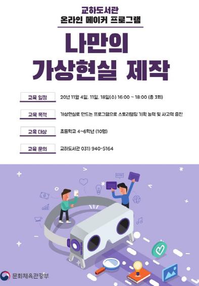 파주시 교하도서관은 오는 10월 31일부터 11월 18일까지 문화체육관광부 공모사업 ‘2020년 공공도서관 메이커 프로그램’을 운영한다.