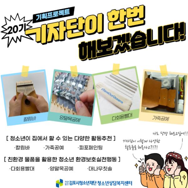 김포시청소년재단 청소년상담복지센터는 장기화되는 코로나19로 지쳐있는 청소년들을 위해 청소년 기자단이 직접 나서 집에서도 즐길 수 있는 다양한 청소년 활동을 소개하고 홍보하는 기획 프로젝트인 ‘기자단이 한번 해보겠습니다’를 11월 한 달간 운영한다.