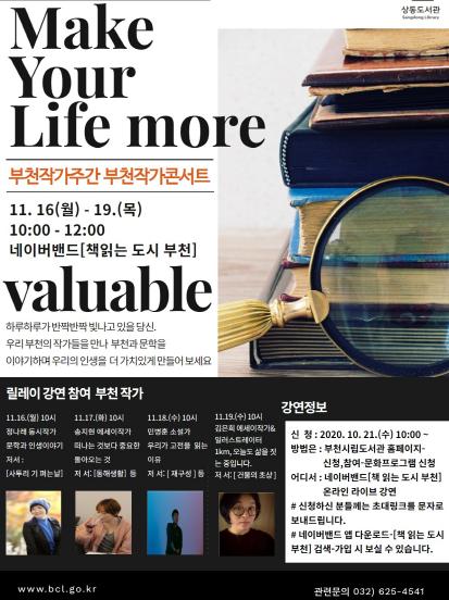 온라인으로 진행되는 강연은 네이버 밴드 ‘책 읽는 도시 부천’에 가입하여 누구나 들을 수 있다. 밴드에 접속할 수 있는 링크는 부천시립도서관 홈페이지에서 신청한 후 문자로 받아볼 수 있다. 기타 궁금한 사항은 상동도서관 독서진흥팀(032-625-4541)으로 문의하면 된다.