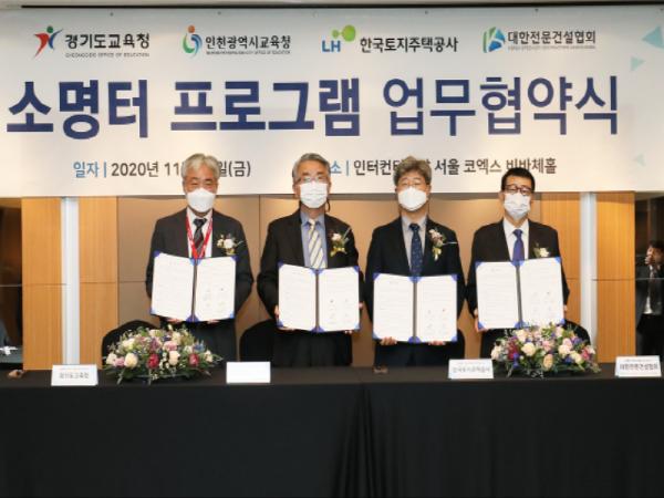 협약식에는 방용호 미래교육정책국장을 비롯해 전광용 인천광역시 교육국장, 권혁례 한국토지주택공사 본부장, 윤왕로 대한전문건설협회 부회장 등 업무 관계자 30여 명이 참석했다.