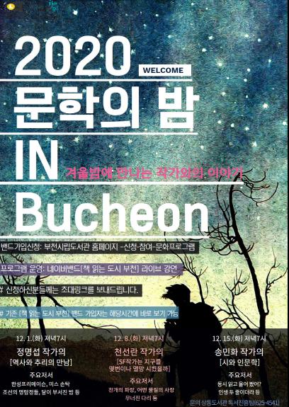 부천시 상동도서관은 12월 1일부터 12월 15일까지 매주 화요일 저녁 7시부터 3회에 걸쳐 작가와 함께하는 <부천 문학의 밤> 릴레이 강연회를 개최한다.