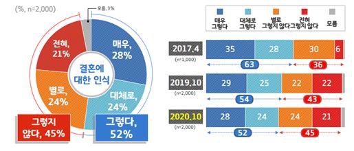 먼저 ‘결혼을 해야 하느냐’는 물음에 52%만이 ‘그렇다’고 답했다. 이는 지난 2017년 조사 시 63%, 2019년 54%보다 낮은 수치다. 응답자 가운데 20~40대 연령대를 살펴보면, ‘결혼을 해야 하느냐’에 ‘그렇다’라는 응답이 47%로 절반에 미치지 못했다. 특히 20~40대 여성 응답은 각각 32%, 40%, 40%로 더 낮았다.