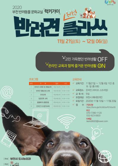 부천시는 반려동물 천만 시대를 맞아 12월 6일까지 반려동물 문화교실 ‘반려견 On-Line 클라쓰’를 운영한다.