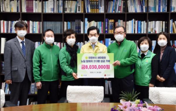 의정부시는 11월 24일 의정부시새마을회 자생단체 특화 뉴딜사업 참여자들이 십시일반 모은 성금 803만 원을 사회복지공동모금회에 기탁했다고 밝혔다.