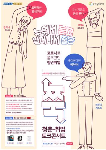 코로나 시대를 살아가는 청년들에게 새로운 비전과 희망을 제시하는 ‘2020 청춘취업 토크콘서트’가 오는 27일 저녁 온라인으로 생방송된다.