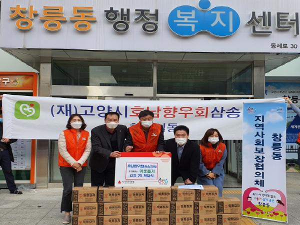 고양시 덕양구 창릉동(동장 양현종)은 25일 고양시 호남향우회 삼송지회(현 회장 공무정, 차기 회장 김병상)로부터 김장김치 20통을 후원 받았다고 밝혔다.