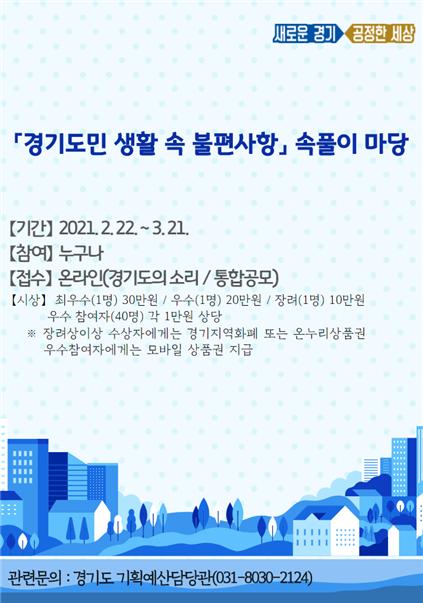 경기도가 ‘지역균형발전’과 ‘도민들의 더 나은 삶’을 위한 아이디어를 발굴, 새로운 정책방향을 모색하기 위한 ‘경기도민 생활 속 불편사항 속풀이 마당’ 제안공모를 신규 추진한다고 24일 밝혔다.