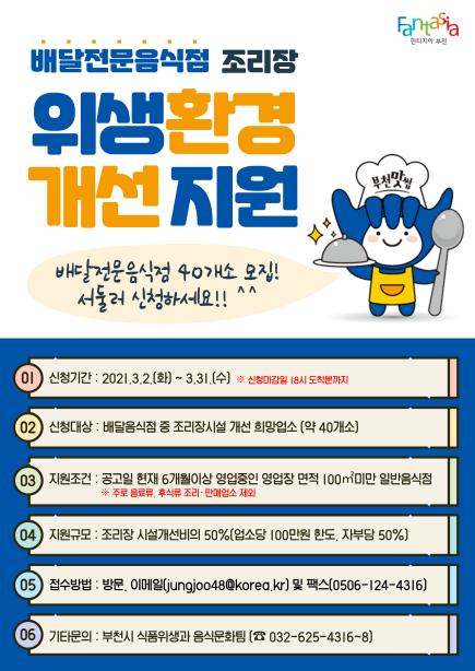 부천시는 배달전문음식점 위생 수준 향상과 안전한 외식문화 조성을 위해 3월 2일부터 31일까지 한 달간 ‘배달전문음식점 조리장 위생환경 개선 지원사업’대상자를 모집한다.