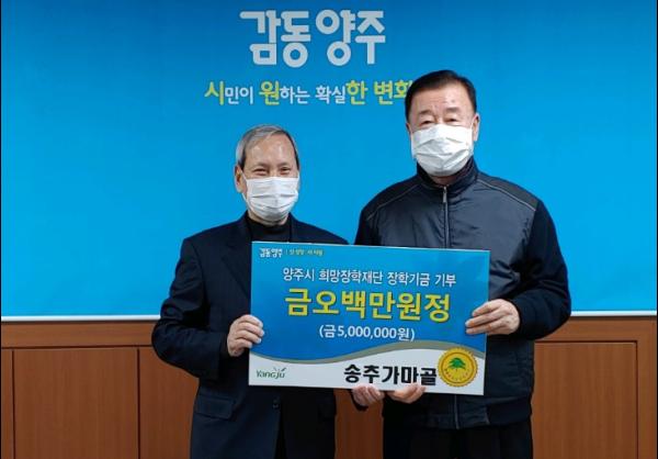 양주시 희망장학재단(이사장 임충빈)은 지난 23일 송추가마골(대표 김재민)에서 지역인재육성을 위해 써달라며 장학금 500만원을 기탁했다고 밝혔다.