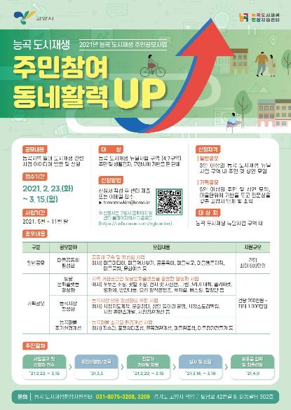 고양시가 오는 3월 15일까지 능곡 도시재생 뉴딜사업 구역을 대상으로 2021년 도시재생 주민공모사업 ‘능곡 도시재생 주민참여 동네활력 UP’신청 접수를 실시한다.