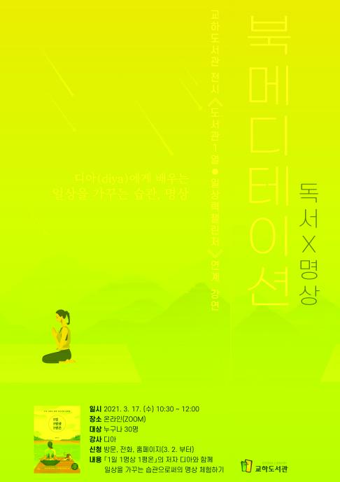 이번 강연은 교하도서관의 도서 전시 코너 ‘도서관 1열’의 3월 주제인 ‘일상력 챌린저’의 연계 행사로 기획됐다. 일상을 가꿀 수 있는 습관 중 ‘명상’을 주제로 <1일 1명상 1평온>의 저자 ‘디아’가 강연을 진행한다.