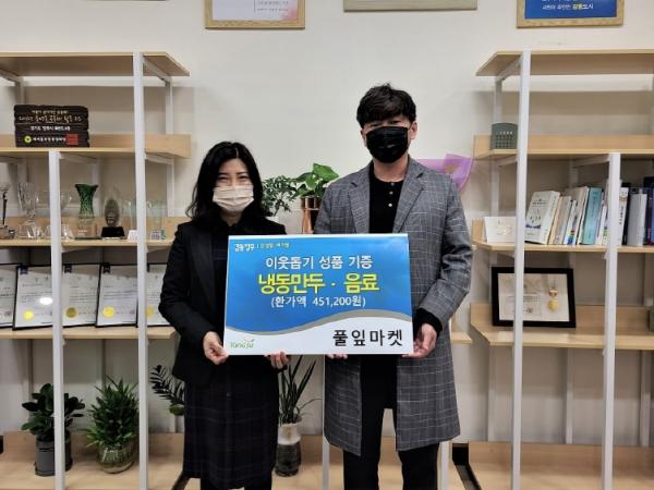 양주시 회천3동 행정복지센터는 지난 24일 풀잎마켓(대표 박민규)에서 센터를 방문해 관내 어려운 이웃에 전달해달라며 냉동만두 360봉과 음료 30개를 기부했다고 밝혔다.