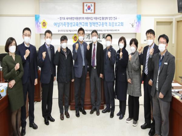 경기도의회 여성가족평생교육연구회(회장 박창순 위원장)는 24일 여성가족평생교육위원회 회의실에서 ‘경기도 육아종합지원센터의 어린이집 지원사업 활성화 방안 연구’에 대한 정책연구용역 최종보고회를 개최하였다.