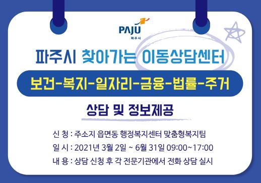 파주시는 코로나19 장기화로 인해 도움이 필요한 취약계층이 언제든지 상담받을 수 있도록 ‘찾아가는 이동상담센터’를 비대면으로 전환해 운영 한다.