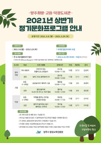 양주시는 오는 3월 8일부터 6월 3일까지 2021년도 상반기 비대면 독서?문화프로그램을 운영한다.