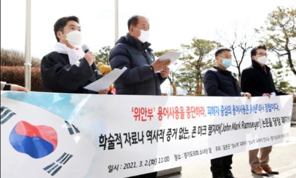 경기도의회 정대운 의원은 2일 오전 경기도의회 소녀상 앞에서 일본군 ‘성노예’ 피해자를 매춘부로 규정한 존 마크 램지어(John Mark Ramseyer) 교수를 규탄하면서, 가해자가 만든 '일본군 ‘위안부’라는 용어를 피해자 중심의 일본군 ‘성노예’로 변경해야 한다는 내용의 성명서를 발표했다.