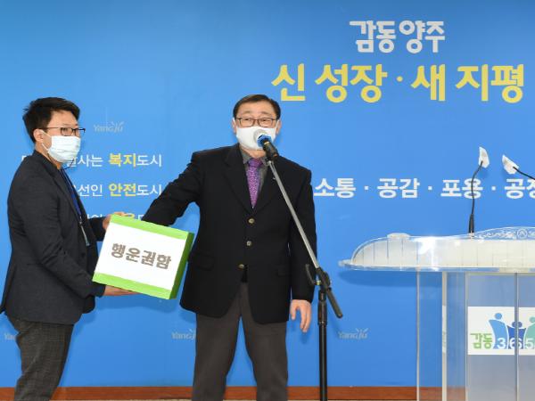 식전행사로 양주시 직장동호회 ‘핑거스토리’가 아름다운 기타 선율과 어우러진 노래로 멋진 공연을 펼쳤으며 이어 포상수여, 부시장 당부말씀, 직원 사기진작을 위한 부서 행운추첨 등 순서로 진행됐다.