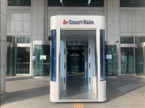 스마트게이트란 건물을 출입하는 사람이 게이트 내부를 통과하는 동안 고성능 필터인 헤파필터가 초미세먼지와 바이러스를 빨아들이고, 자외선(UV-C)을 활용해 살균하는 통로형 공기청정시스템이다.