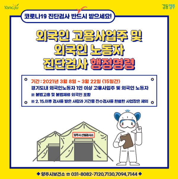 이성호 양주시장은 “이번 행정명령은 경기도 내 외국인 노동자 밀집지역 집단감염 발생 증가에 따라 지역사회 감염확산을 차단하기 위한 불가피한 조치”라며 “선제적 진단검사 실시로 빈틈없는 방역망 구축하는 등 지역 내 집단감염을 사전에 방지하기 위해 외국인 고용사업주들의 적극적인 협조를 당부드린다”고 밝혔다.
