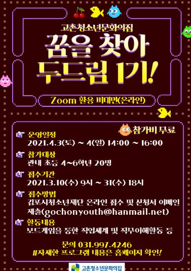 오는 3월 10일 오전 9시부터 김포시청소년재단 온라인통합접수 시스템에서 선착순으로 접수가 시작되며, 온라인접수와 함께 참가신청서를 고촌청소년문화의집 이메일로 제출하면 된다.