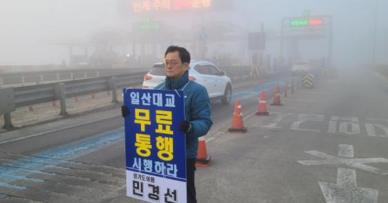 민경선 의원은 시위에 앞서 “한강 27개 다리 중 유일하게 통행료를 13년간 부담하면서 일산대교를 이용하고 있는 인근지역 주민들의 소외감과 불편함을 이번만큼은 반드시 해소해야 한다 ”며, “안개가 자욱한 일산대교 앞 1인시위를 하다 마무리할 때쯤 안개가 사라졌듯 해결의 실마리가 풀려 비싼 통행료도 사라기길 바란다”고 언급하며 이날 오전 7시 30분부터 9시까지 ‘일산대교 무료통행 시행하라’는 내용이 담긴 피켓을 들고 1인 시위를 펼쳤다.