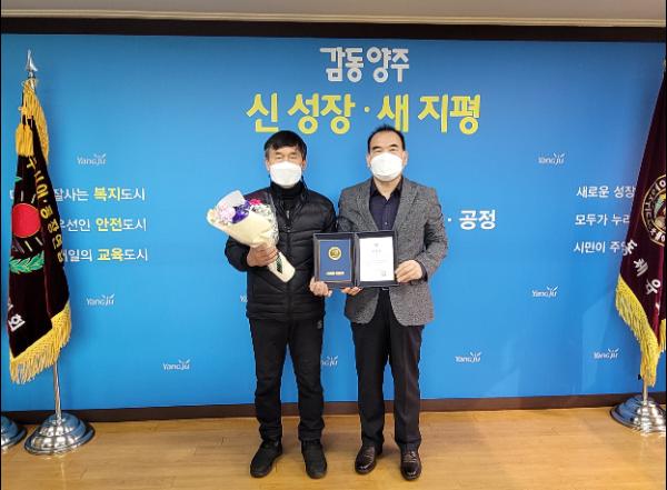 양주1동은 12일 행정복지센터 동장실에서 눈치우기 선행을 펼친 김병관 대원에게 경기도지사 훈격 선행도민상 표창을 전수했다.