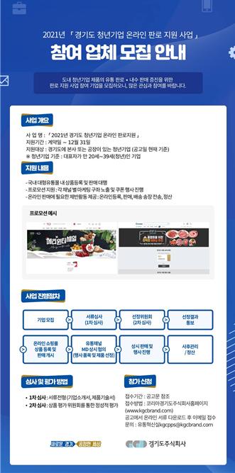 경기도주식회사는 도내 우수기업 제품 판로 확대를 위해 이 같은 내용의 ‘2021년 경기도 청년기업 온라인 판로지원 사업’을 추진, 참여 업체를 모집한다고 17일 밝혔다.