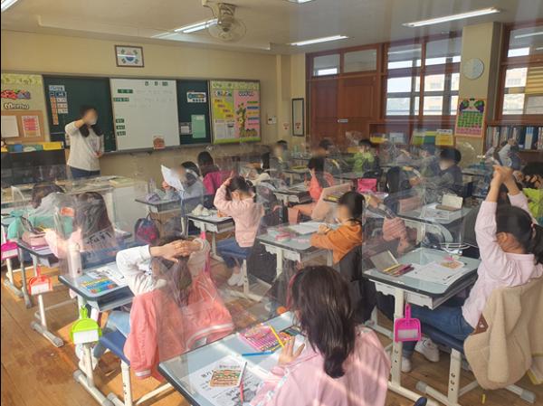 # 지난 11일 경기도 포천의 태봉초등학교 2학년 교실에는 20명의 학생들이 수업에 열중하고 있었으며, 3월 개학과 함께 새로 설치한 공기정화장치가 쉼없이 가동되고 있었다.