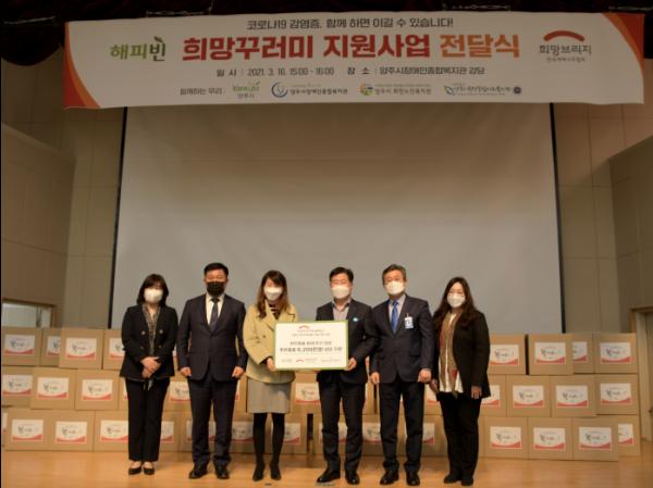 성금 4,200만원은 방역물품, 식료품 등을 담은 희망꾸러미로 제작하여 양주시장애인종합복지관 및 양주시 회천노인복지관, 양주시옥정종합사회복지관 등 3개 기관을 통해 관내 저소득 장애인, 노인 등 지역주민 600가정에 전달되며, 2,000만원 상당의 상품권은 코로나19 장기화로 어려움에 처한 장애인 세대 200가정에 지원될 예정이다.