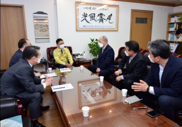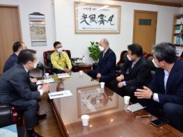 정하영 시장이 17일 오전 상공인의 날을 맞아 이규식 김포상공회의소 회장과 간담회를 개최하고 축하 메시지를 전달했다.