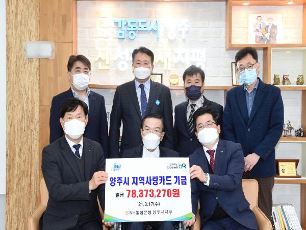 양주시는 17일 시청 시장실에서 NH농협 양주시지부(지부장 오주학)로부터 제휴카드 적립 기금 7,837만원을 전달받았다고 밝혔다.