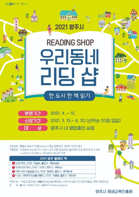 양주시는 책 읽는 시민문화 정책을 위해 ‘2021 양주 올해의 책’을 활용한 ‘양주 우리동네 리딩 샵(READING SHOP)’을 운영한다.