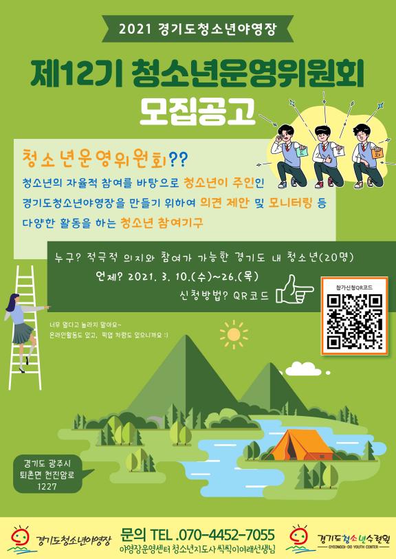 경기도청소년야영장이 ‘제12기 청소년운영위원회’ 운영에 참여할 청소년 위원을 공개 모집한다.