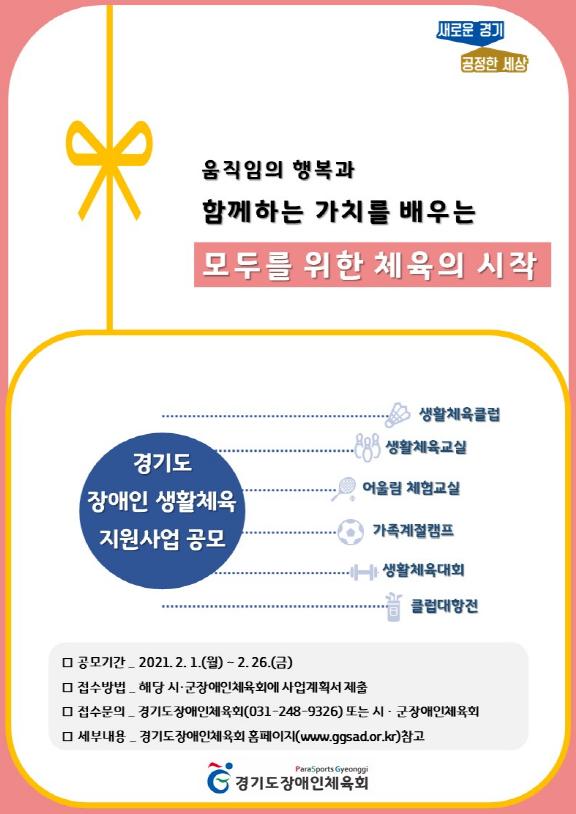 ‘생활체육교실 지원사업-소외계층(맞춤형) 교실’은 경기도장애인체육회에서 장애인 생활체육의 활성화를 목표로 추진하는 사업 중 하나로 여성 또는 중증장애인 등 소외계층의 생활체육교실 운영에 대한 비용을 지원한다.