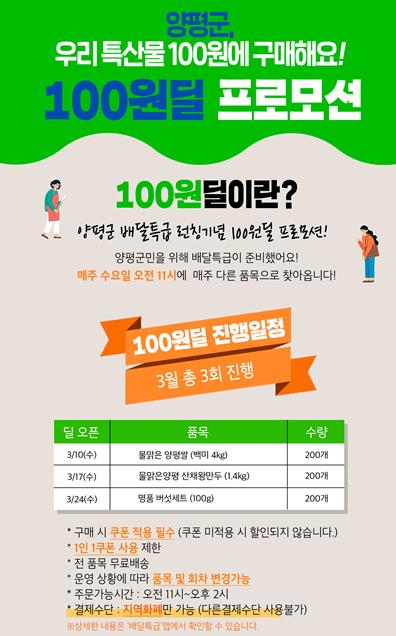 경기도주식회사는 지난 10일과 17일 진행한 배달특급 '100원딜' 이벤트에서 양평쌀과 산채왕만두 총 400개가 매진됐다고 18일 밝혔다.