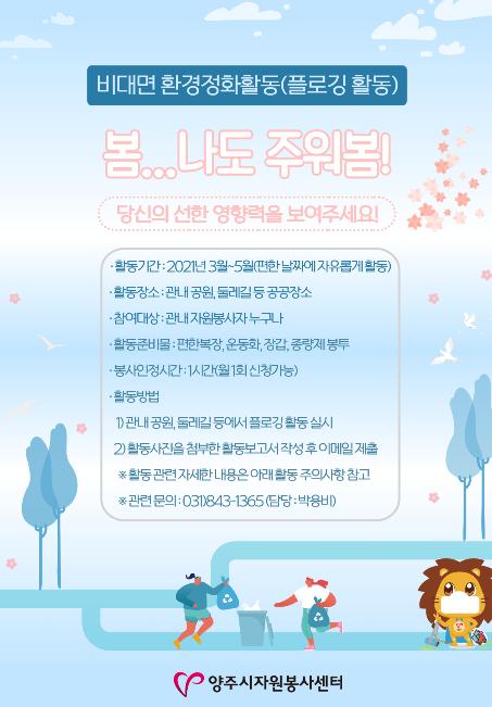 양주시자원봉사센터는 봄을 맞아 관내 공원과 등산로 등에서 플로깅 활동을 하는 비대면 환경정화 봉사활동 ‘봄…나도 주워봄’을 실시한다.
