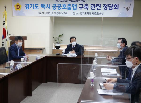 경기도의회 건설교통위원회는 3월 18일 경기도의회 제1정담회실에서 경기도 교통국 택시교통과, 경기도 개인택시조합 및 법인택시조합 관계자들과 함께 ‘경기도 택시 공공호출앱’구축과 관하여 논의하고자 정담회를 개최하였다.