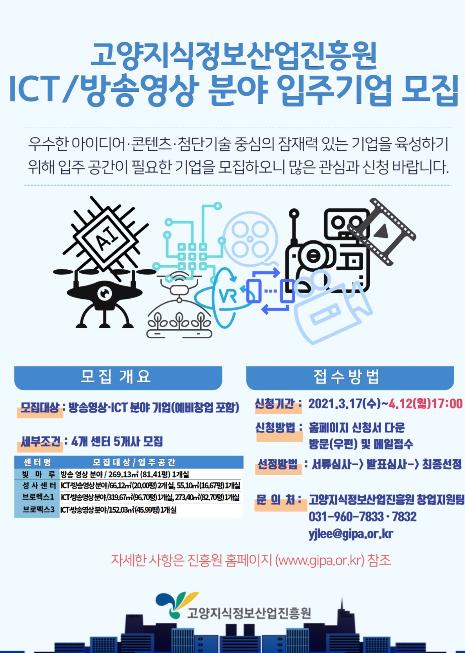 고양지식정보산업진흥원이 운영하는 입주센터에서 오는 4월 12일까지 ICT(정보통신기술) 및 방송영상 분야 2021년 신규 입주기업을 모집한다.